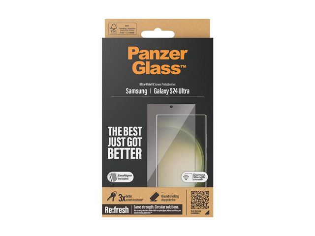 60% recycled glass. 100% strength. 100% original. With high-level scratch resistance, impressive shock-resistance capabilities, and groundbreaking drop protection, this PanzerGlass screen protector shields your phone screen from accidental bumps, crushing falls, and other hazards of everyday life. It's made of almost two-thirds recycled glass and even has a smudge-free coating that reduces traces of fingerprints and grease to provide you with a clear screen view. With the enclosed EasyAligner made of 100% recycled plastic, installation is a piece of cake (seriously!). To make it even easier, we've included step-by-step instructions as well as a QR code for quick access to our online how-to video. And remember: Once installed, you'll never again fear your phone falling screen-first. This might not happen, but then again … it might!   This screen protection prolongs the lifetime of your phone so that one day you can pass it on to someone else who will love it just as much as you do. It's the new circle of phone life and one way of working toward a more sustainable future. Another is to use less packaging. In 2024, we reduced the amount of paper in our PanzerGlass core product packaging design by an average of 66%*. So, of course, this product comes in a recyclable FSC-certified box. The screen protector is Ultra-Wide Fit. This means it covers the front surface of your phone, providing a complete view of your screen while leaving a little room around the edges for a PanzerGlass case, for example, a fearlessly fashionable case from CARE by PanzerGlass . And if you're thinking: "What if my camera lenses get scratched?" Well, help is just a few clicks away: Combine your screen protector and case with PanzerGlass PicturePerfect or Hoops . *Reduction from 2022-2024 measured by comparing selected products from the PanzerGlass core range.